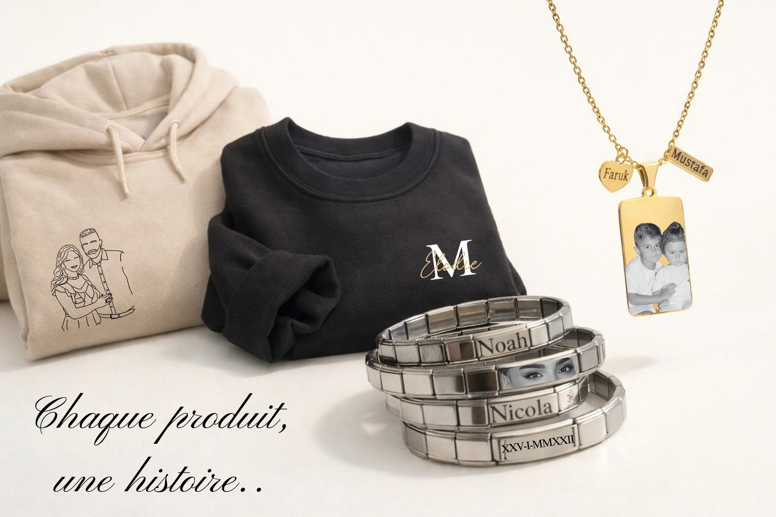 Offrez ou portez des vêtements et accessoires qui racontent votre histoire.Sweats, t-shirts, bijoux gravés : chaque pièce est personnalisée avec soin pour refléter votre univers.